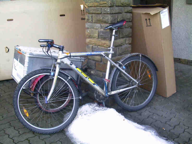 Zielsetzung bei diesem Rad war: so leicht und zuverlässig wie möglich und günstig noch dazu. Rausgekommen ist das da unten. So leicht wie möglich heißt 10,3 kg plus Schutzbleche (die müssen da dran, da ich eigentlich bei jedem Wetter und fast überall fahre, außerdem ist es besser, wenn man nicht völlig verdreckt bei den Kurierkunden ankommt) und Dreck, also knapp 11 kg. Das mit dem "günstig" hat auch hingehauen, da ich fleißig Angebote studiert und viele "alte" Teile angeschraubt habe. |