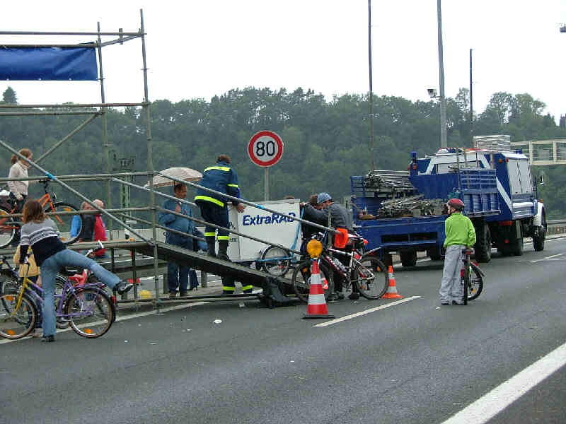 Gegen 17.30h wird die Veranstaltung dann etwas früher als geplant von kräftigem Regen aufgelöst. Auch die fahrbare Werkstatt geht jetzt wieder zurück in den Fahrradladen. Allerdings ging der Wechsel der Fahrbahnseite nicht ohne Hilfe. Aber dank der THW-Mitarbeiter war das Problem recht schnell gelöst, und es konnte auf den Heimweg gehen. |