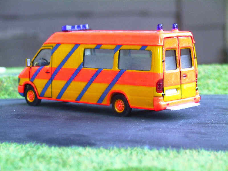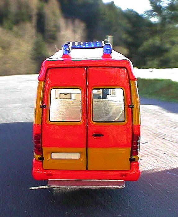 Im Gegensatz zum "normalen" Baby-NAW ist dieses Fahrzeug auf der Langversion des Sprinter aufgebaut. Das ist so geschehen, um außer einer Trage noch den Inkubator quer, also durch die Schiebetür einladen zu können. Die Querlagerung bedeutet weniger Belastung insbesondere für die Wirbelsäule der kleinen Patienten. Bei Vorbildfahrzeugen wird meist aus Kostengründen auf diese Variante verzichtet, und der Inkubator in Fahrtrichtung auf dem Tragetisch angebracht. |