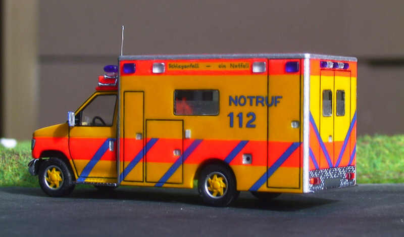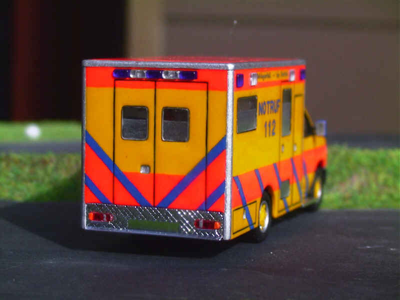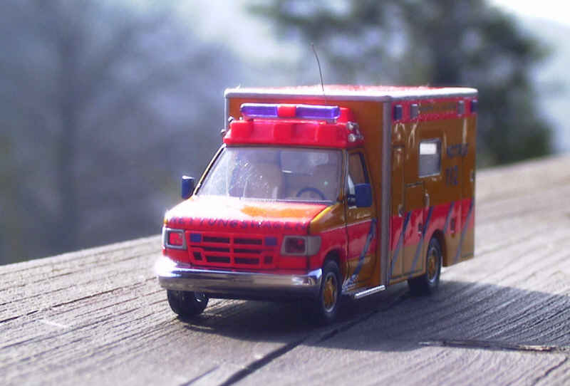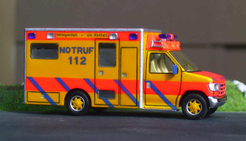 Noch ein neuer Rettungswagen für die Rettungspreiserlein: ein Ford E-350 mit Kofferaufbau (aus dem Hause Busch). Auch an diesem Modell wurden wieder einige Änderungen vorgenommen. Neben der neuen Farbgebung erhielt der Ford auch einen nahezu vorbildgerechten Innenausbau im Patientenraum. |