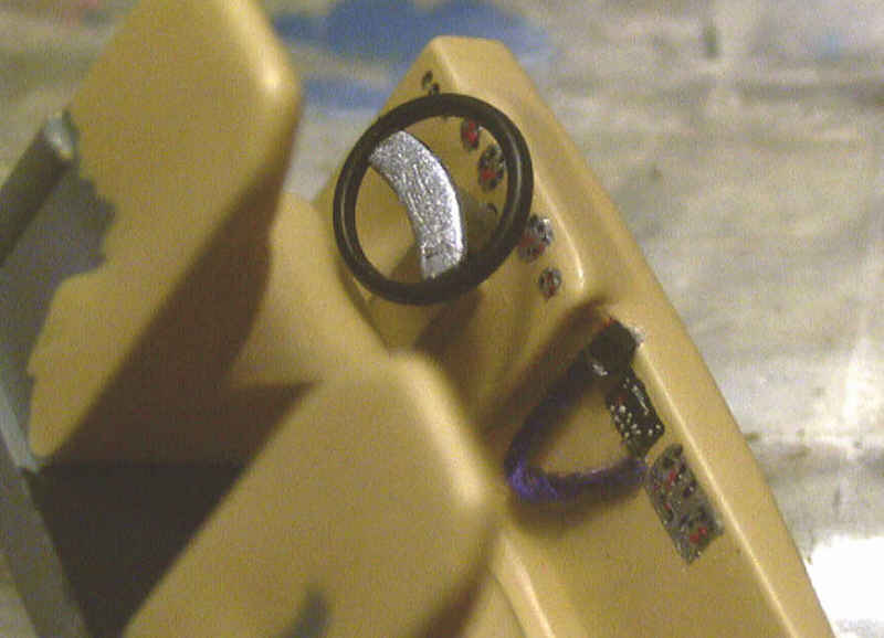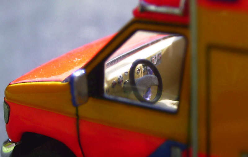 Auch bei diesem RTW dürfen einige Kleinigkeiten nicht fehlen. Z.B. die Steckdose, die Beschriftung, die Martinshörner oder die Antenne. Die ursprünglich dunklen Scheiben wurden gegen transparente ausgetauscht, die dann noch im unteren Teil mattiert worden sind. |