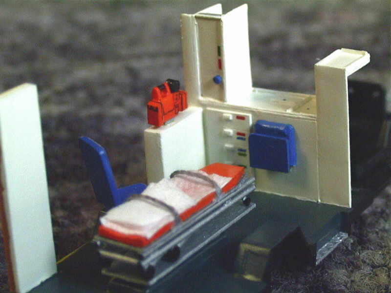 Der Ausbau des Patientenraums. Da Busch dem Modell keinen Innenausbau spendiert hat, habe ich mal wieder zu Bastelmesser, Polystyrolplatten, Pinzette und vielem Anderen gegriffen und selbst einen Ausbau gebaut. Wie oben geschreiben, ist die Einteilung frei erfunden, bzw. an die Fensteranordnung angepasst. |
