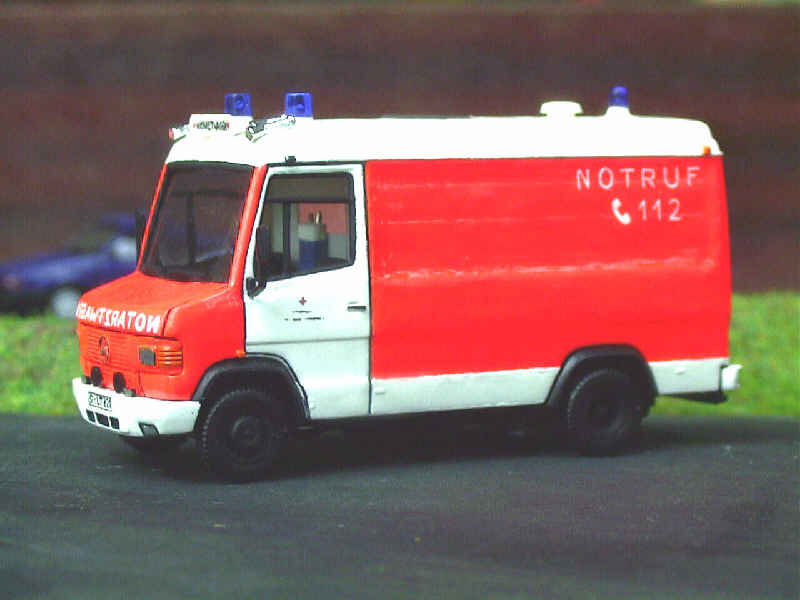 Das Vorbild dieses Fahrzeugs hatte einen Ausbau von der Firma Binz, ansonsten einen für bergige Gegenden etwas schwachbrüstigen Motor, aber dafür viel Platz im Patientenraum, um darin zu arbeiten. Die Ausstattung umfasste alles was in so ein Auto eben rein gehört. Das Modell ist aus einem ebensolchen von herpa entstanden. |