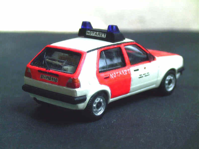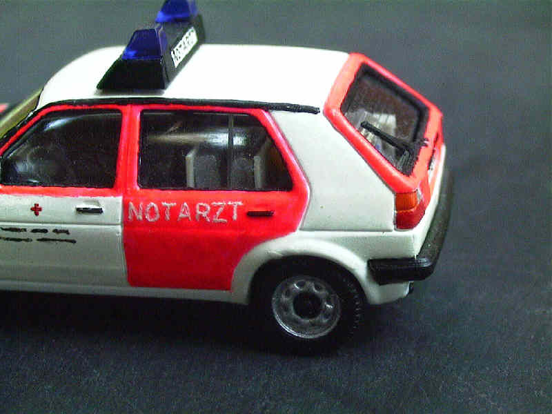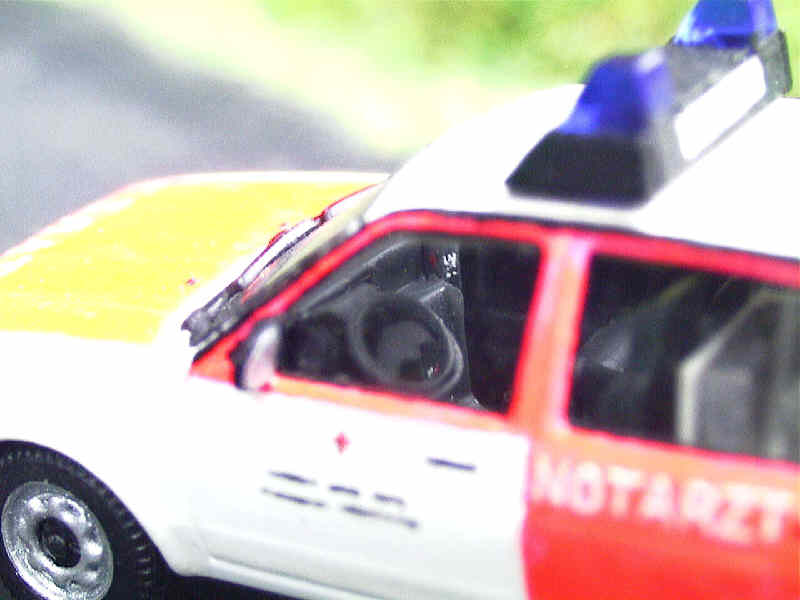 Hier mal einige Ansichten von außen, auch wenn sich bis auf die Farbe wenig getan hat: ein Blaulichtbalken auf dem Dach und Zusatzscheinwerfer unter der Stoßstange. |