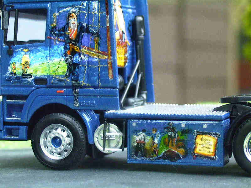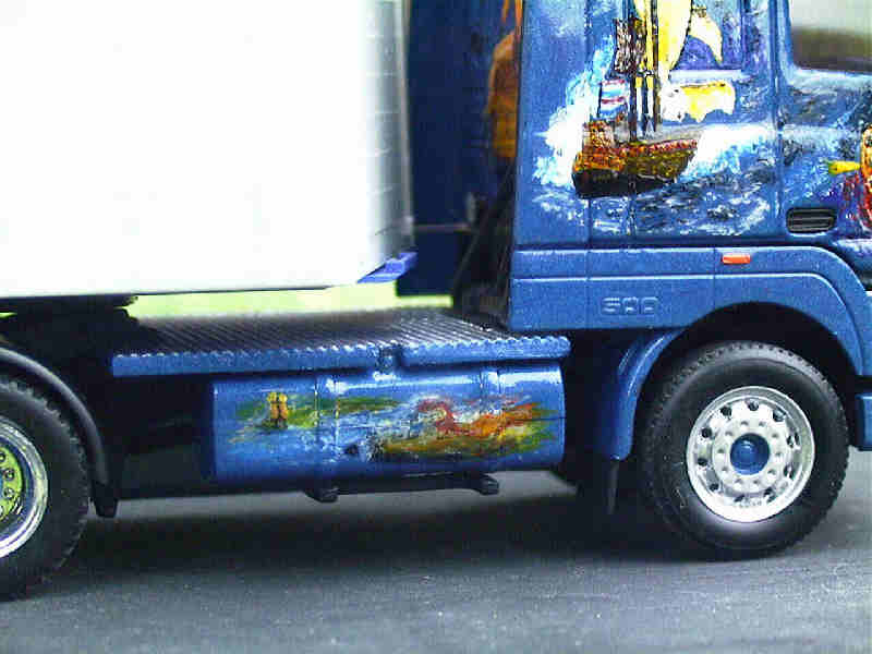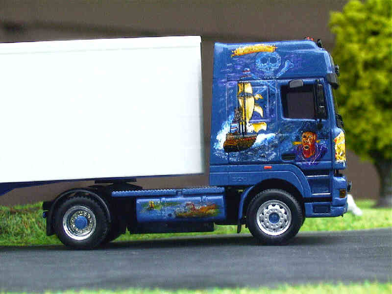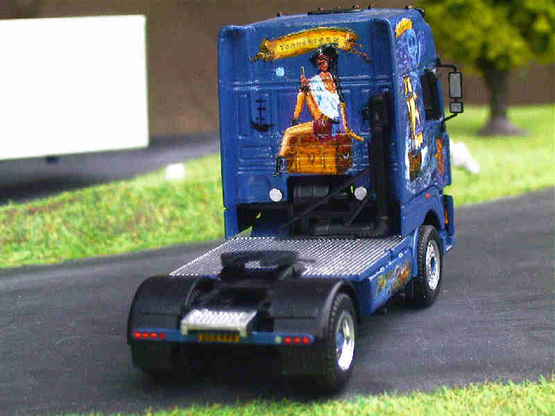 Besitzer des Originals: Cor van der Tonnekreek (NL). Ein meiner Meinung nach wunderschöner Truck, der rundum mit Airbrush-Motiven im Piratendesign versehen ist. Die Umbaumaßnahmen umfassten neben den vielen Lampen noch eine Riffelblechplatte auf dem Fahrgestell, sowie den Staukasten auf der linken Fahrgestellseite. Das Grundmodell stammt von AWM. Das Original wurde übrigens in der Ausgabe 8/98 des Magazins "Fernfahrer" ausführlich vorgestellt. |