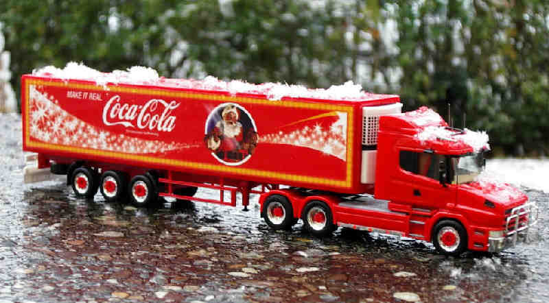 Alle Jahre wieder gehören die gut beleuchteten Cola-Trucks zu den Attraktionen rund um das Weihnachtsfest. Auch Alexander Dosenberger hat sich jetzt zwei Fahrzeugen dieser Art angenommen. Allerdings kommen im Gegensatz zu den Originalen hier zwei Scania-Hauber als Zugmaschinen zum Einsatz, was aber sicherlich keine schlechte Lösung ist. Die Auflieger hat Alexander auf dem Flohmarkt erworben, die Metallfahrgestelle gegen solche von herpa ausgetauscht. Die Zugmaschinen stammen ebenfalls aus dem herpa-Programm. Anschließend wurden die beiden Züge noch ein wenig verfeinert und mit einigen netten Details ausgestattet. |