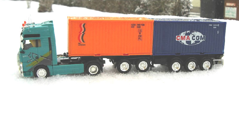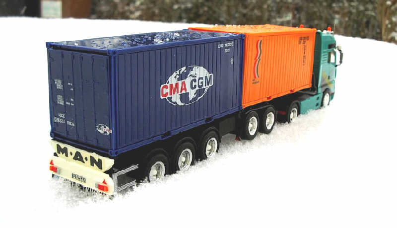 In Alexanders Fuhrpark finden sich auch verschiedene Container-LKW. Einige davon zeige ich Euch mal hier. Die ersten beiden sind dabei aus Werbemodellen bekannter Zeitschriften entstanden, während der dritte eine Sonderform des Containertransports zeigt. |