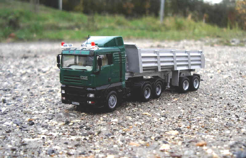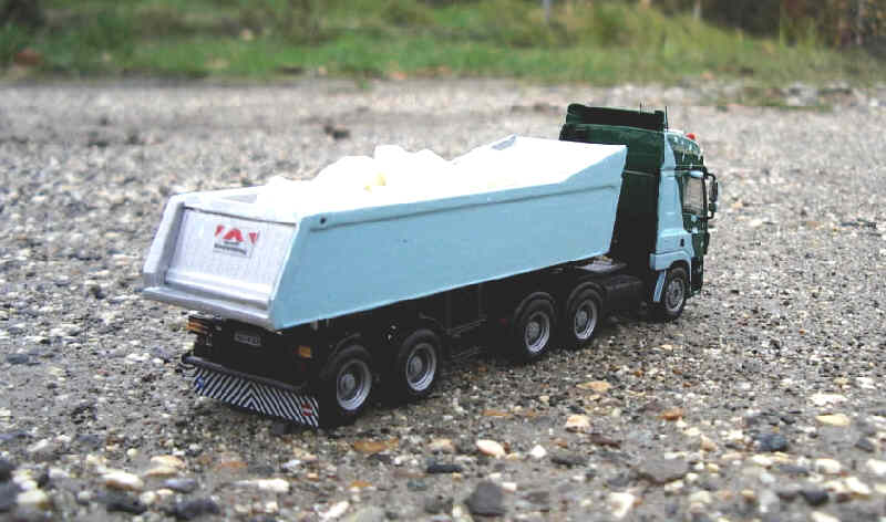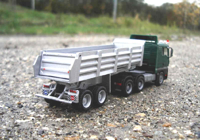Auch der Auflieger mußte noch in der Werkstatt vorbei, bevor er auf die Straße dürfte. Neben der Farbe der Seitenwände hat die Kippmulde vorne einen erhöhten Steinschlagschutz bekommen. Ansonsten kommen wie gehabt einige Kleinigkeiten zur Verfeinerung des Modell zum Einsatz, wie lackierte Rückleuchten und Spritzschutzlappen. |