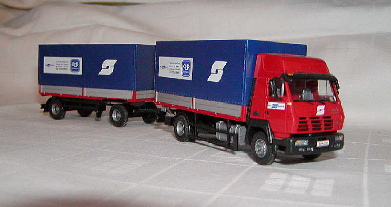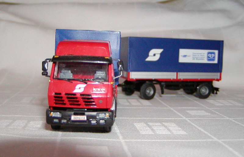 Die Seitenansicht zeigt noch mehr Details: Das Modell wurde farblich behandelt und mit Schriftzügen der ÖBB versehen. Der Anhänger ist aus mehreren Teilen zusammengesetzt. So kommt das Fahrgestell von VAB, der Aufbau wurde einem anderen Steyr entnommen und die Felgen stammen aus dem Hause B&S. |