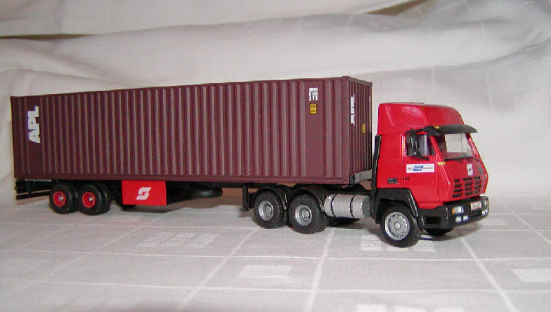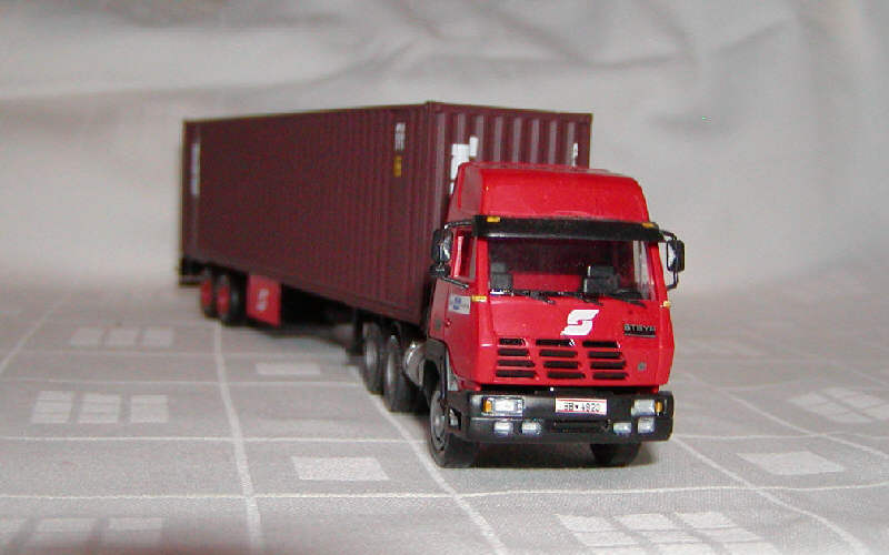 Das zweite Modell in den Farben der ÖBB: Ebenfalls ein Steyr, aber dieses mal als dreiachsige Sattelzugmaschine mit Containerauflieger. Die Lichter passen auch hier mal wieder;-) |