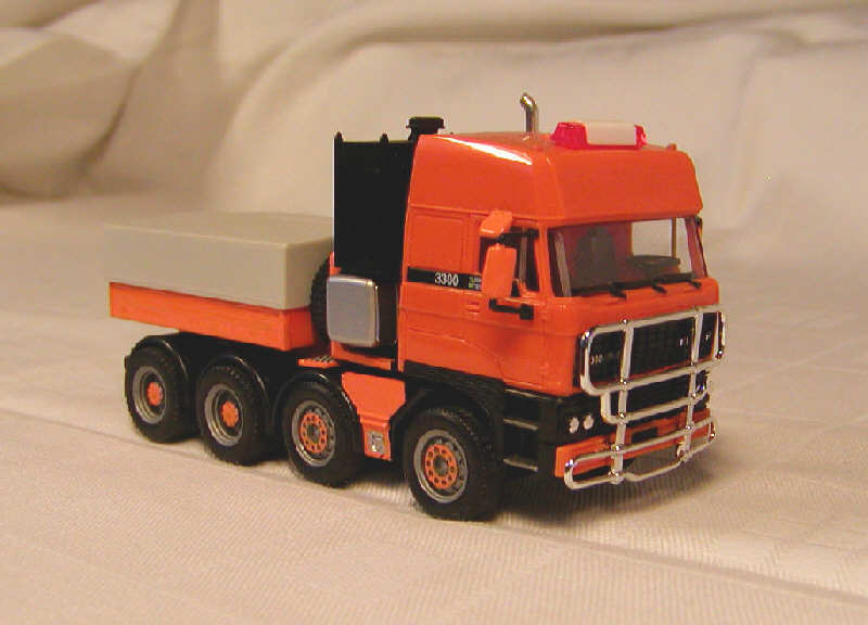 Ein weiteres Auto aus der Werkstatt von Leopold: Eine Schwerlastzugmaschine auf Basis eines DAF 3300 SpaceCab. Das Fahrerhaus ist dazu auf ein Modernes 8x4/4-Fahrgestell gesetzt worden. Auch dieses Modell enthält mal wieder einige nicht ganz serienmäßige Details. So z.B. der Rammschutz, die Werkzeugkästen (ehemals Zubehör für Feuerwehrfahrzeuge) und natürlich mal wieder die Farbe. |