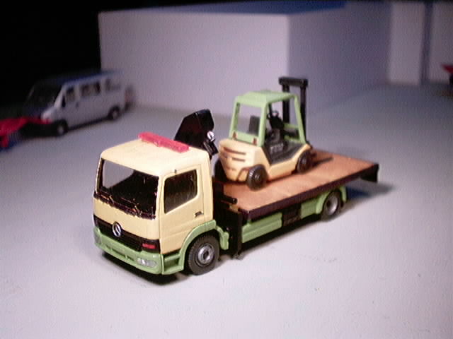 Mercedes Atego mit Ladekran und Flachbettpritsche Das Modell hat statt des Abschleppaufbaus eine Flachbettpritsche bekommen und kann jetzt für alle möglichen Transporte eingesetzt werden. Auch die Lackierung in grün und gelb macht sich recht gut. |