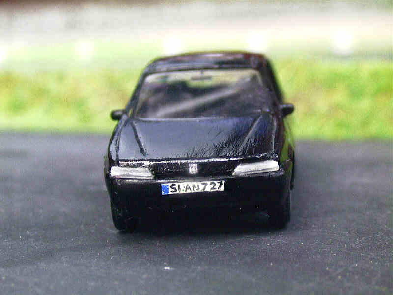 Auf diesem Foto von hinten. Die Radkappen stammen von einem Audi 80 von Rietze, die Audi-Ringe wurden entfernt. Daß man einige Klebestellen mehr sieht als normal liegt daran, daß das Modell vom Original die Eigenschaft ständig kaputtzugehen übernommen hat. |
