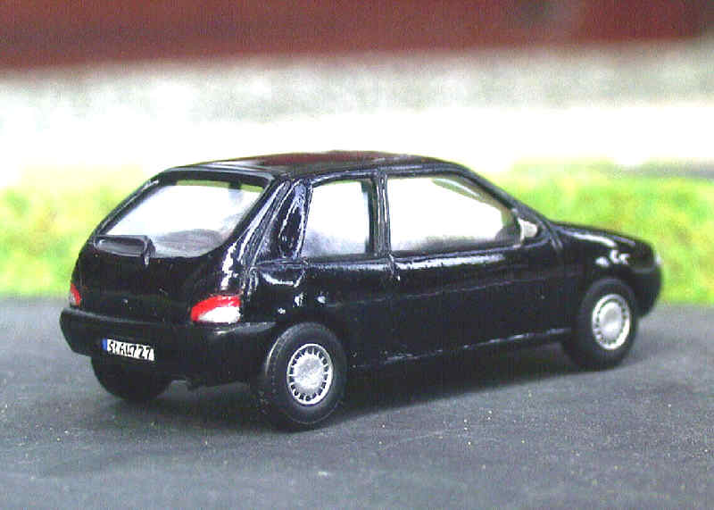 Das ehemalige Auto meiner Schwester (deshalb habe ich ihn gebaut): Ein Peugeot 106 XT. Ein (meiner Meinung nach) grauseliges Auto. Klein, fast immer kaputt und einen Wendekreis wie ein LKW. Das Modell ist aus einem Ford Fiesta von Rietze entstanden. |