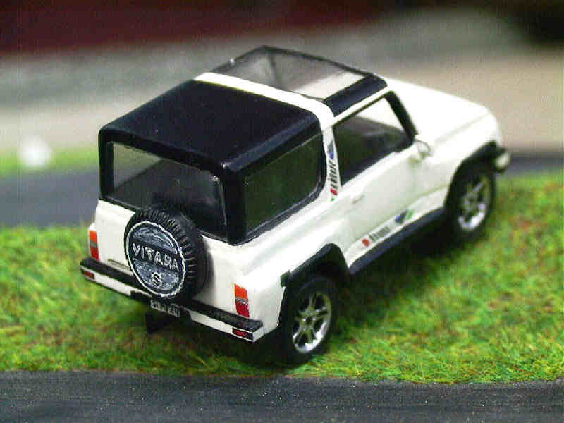 Suzuki Vitara. Ein Modell, an dem doch ein wenig gearbeitet werden mußte. Als Basis für dieses Modell diente ein Suzuki SJ 410 von Rietze, der dann in vielen Arbeitsschritten verändert wurde. Kotflügel ausstellen und verbreitern, Frontpartie neu gestalten, Dach absägen und durch ein zweiteiliges Hardtop ersetzen... aber seht selbst. |