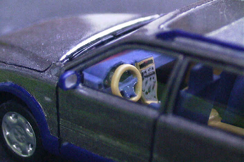 Das ist das Modell, das drei Monate meiner Zeit in Anspruch genommen hat. Ich habe mir mal erlaubt, ein wenig mit Farbe zu spielen. Zum Glück konnte ich den zukünftigen Besitzer des Modells von "Rentnersilber" zu Eisengrau-Metallic umstimmen. Die Dunkelblau-Metallicfarbenen Stoßfänger (und sonstigen Anbauteile) habe ich mal so lackiert, weil mir das originale (blau-)schwarz zu farblos gewesen wäre. Noch so als kleiner Hinweis: Die Felgen stammen von einem Opel Omega MV6 von herpa. |