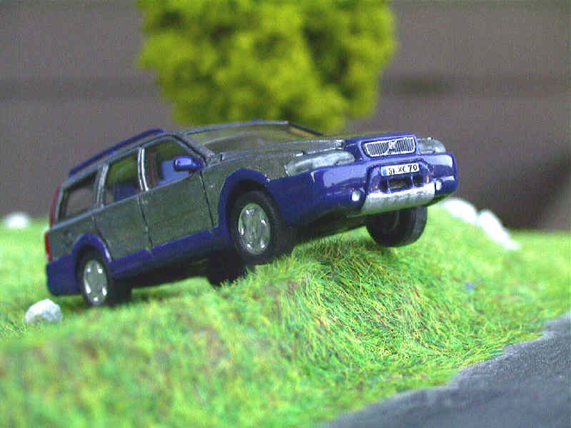 Noch mal Volvo auf´m Berg. Hier kann man die Aluminium-Schutzplatte unter der Stoßstange ganz gut sehen. Nur so zur Anmerkung: Das Nummernschild ist nicht von einem entsprechenden Original abgeguckt. Da das Modell aber ohnehin irgendwann eines erhalten hätte, habe ich das "Anschrauben" einfach mal vorweggenommen. |