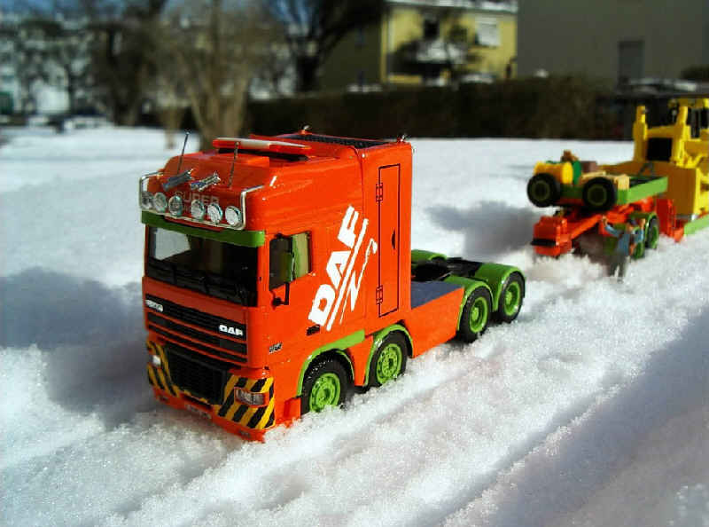 Da die Panne nicht allzu weit vom Firmenhof passiert war, wurde schnell eine Ersatzzugmaschine herbeigerufen. Der DAF ist mittlerweile eingetroffen und wird an den Tieflader angekoppelt. |