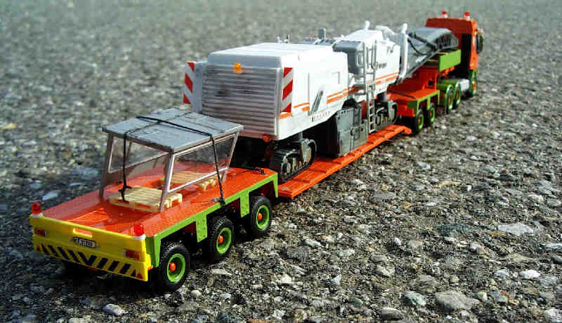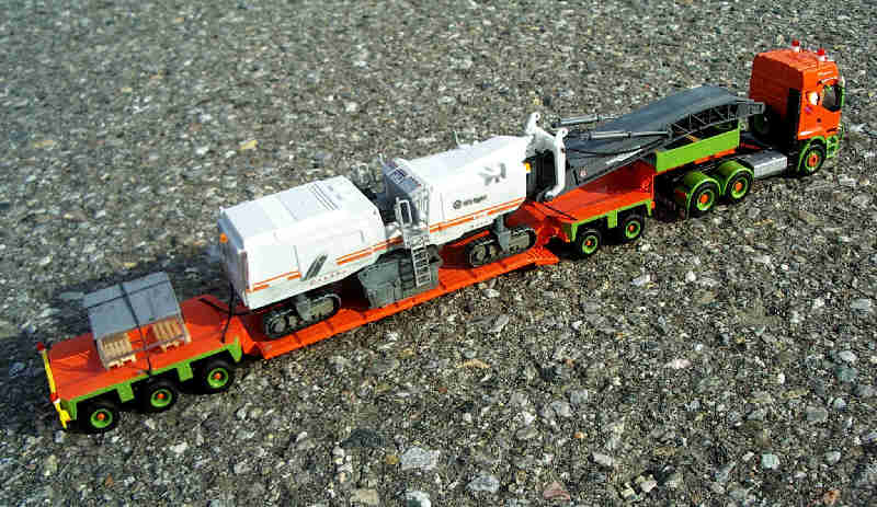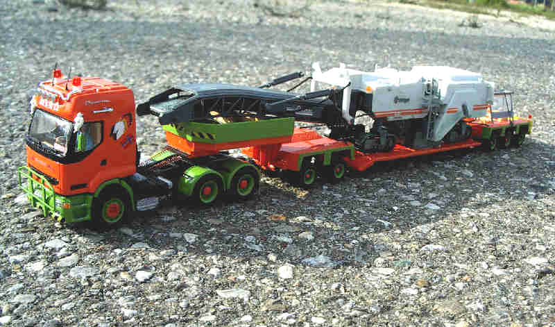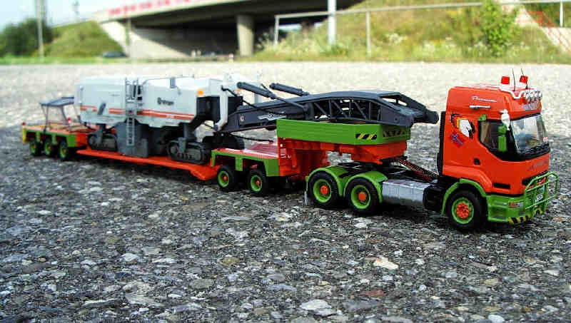 Zu den zahlreichen Baugeräten, die Alexanders Spedition transportiert, gehört auch diese Straßenfräse. Um sie sicher von A nach B zu bringen wird ein Renault Premium nebst Goldhofer-Baggerbrücke eingesetzt. |