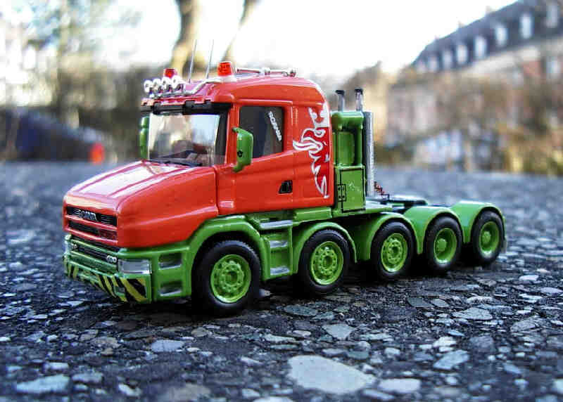 Das XXXL-Haus wurde mittels zweier TG-A-Fahrerhäuser hergestellt. Das Scania-Fahrgestell wurde verlängert und mit zahlreichen Achsen versehen. Weiterhin wurde ein Schwerlastturm aufgebaut. Nicht zu vergessen das ganze Zubehör. |