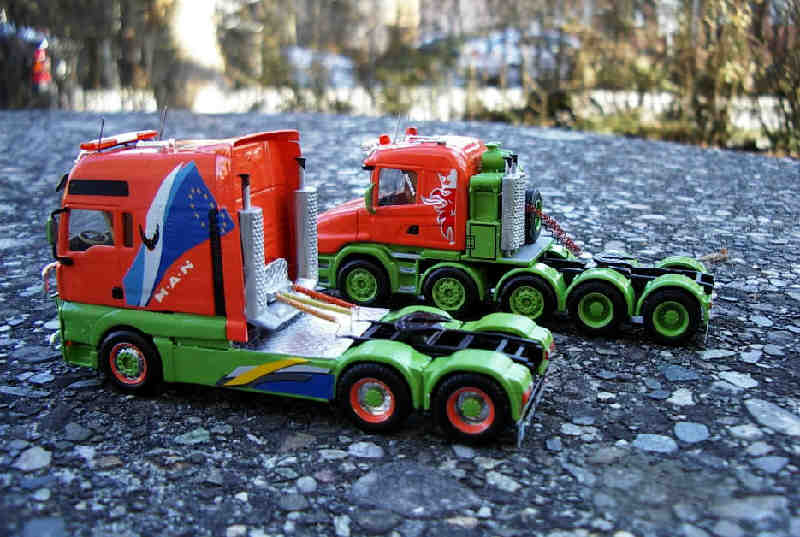 Diese beiden Autos stehen auch in Diensten der Spedition. Zum einen ein MAN TG-A mit riesigem Fahrerhaus, zum anderen ein Scania Hauber mit zahlreichen Achsen. |