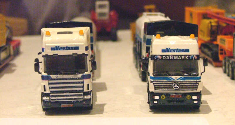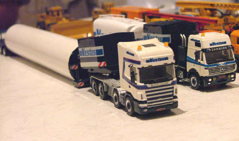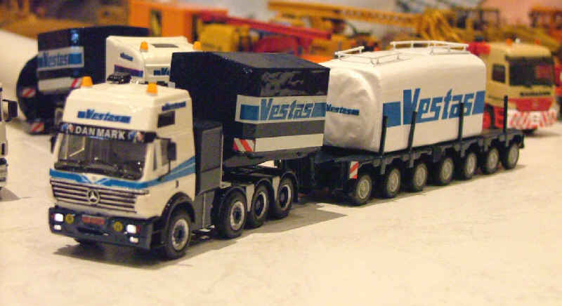 Nun mal noch zum derzeit recht beliebten Transport von Windkrafträdern. Auch dazu hat Günter Modelle gebaut. Zum einen diesen Zug mit Generator auf dem Tieflader. Gezogen von einer MB 3553 Zugmaschine in Vestas-Beschriftung. |