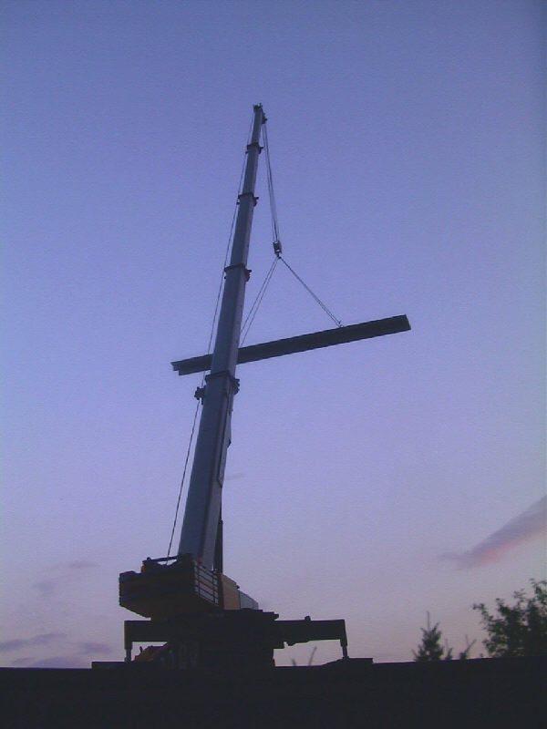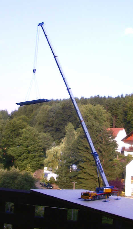 Leider kein besonders gutes Foto, aber man kann zumindest das Ausmaß des Kranes erkennen. Das zu hebende gut ist eine der Betondeckenplatten, die der eine oder andere vielleicht schon vom Bilderbogen des Volvo bzw. Scania mit Teletrailer kennt. |