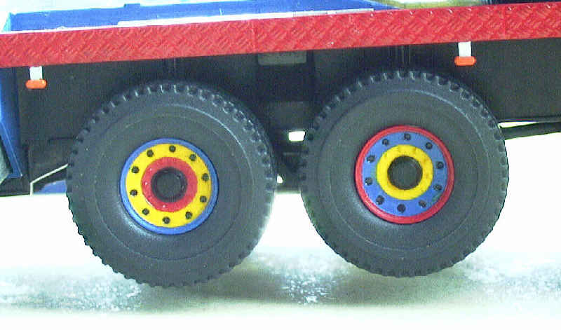 Eine Detailaufnahme der Räder. Die detaillierten Felgen gefielen mir schon am Spritzling recht gut. Da habe ich mir gedacht, daß man auch die farblich entsprechend gestalten kann. Das Ergebnis seht Ihr hier. |