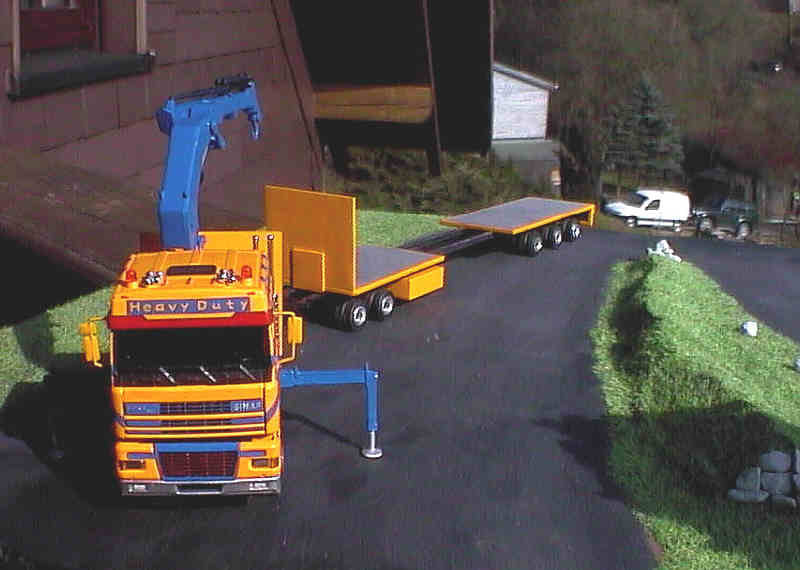 Etwas extravagantes darf man ja schon besitzen. Im Falle von Heavy Duty ist es dieser GINAF. Allradantrieb, Ladekran, Flachbettpritsche, Teleskopanhänger ... Das Modell ist aus einem Vierachsfahrgestell von memo (dem die zweite Achse abgenommen wurde) und einem DAF XF SpaceCab Fahrerhaus von AWM entstanden. Der Ladekran kommt wie meistens von kibri. Der Anhänger ist ein Eigenbau. Mir ist zwar kein Vorbild für den Anhänger bekannt, aber er macht sich dennoch ganz gut. Und wie gesagt, extravagant darf ja auch mal sein. |