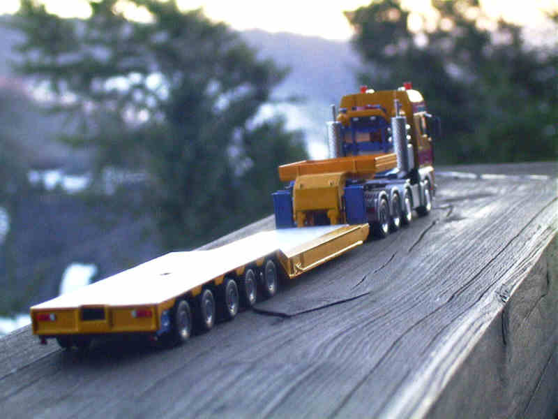 Nach dem Fototermin wieder auf dem Heimweg. Der Tieflader ist übrigens vom Scania-Hauber geliehen. Man kann so eine große Zugmaschine ja nicht solo zu den Fotografen schicken, die würden sich am Ende wohl noch beschweren;-) |