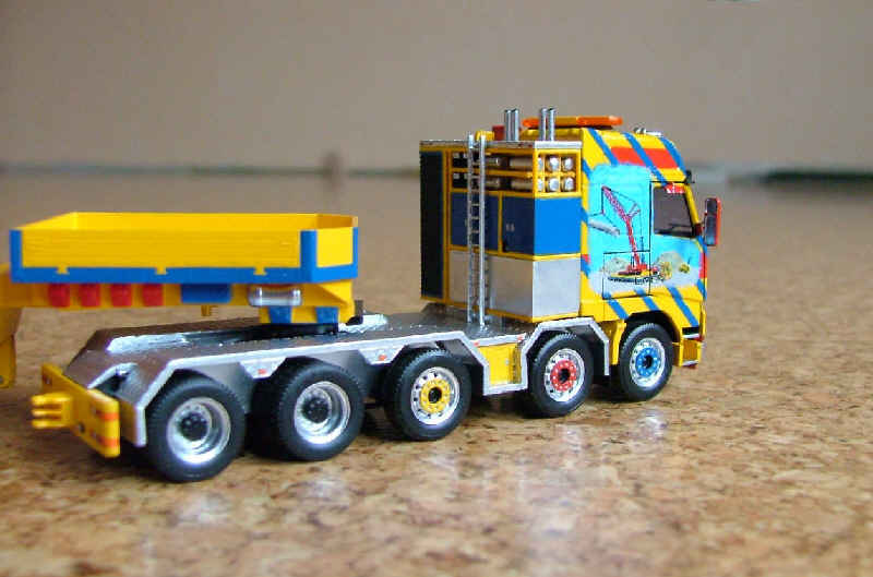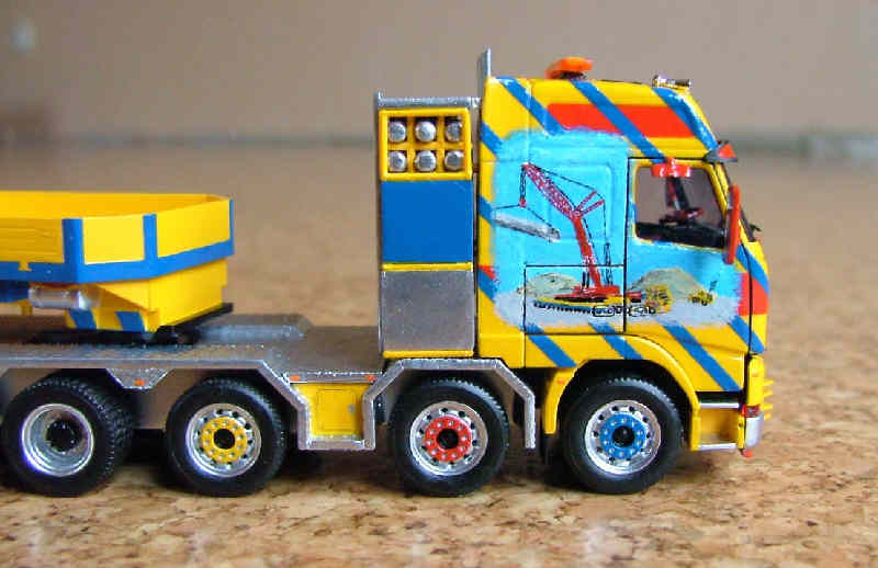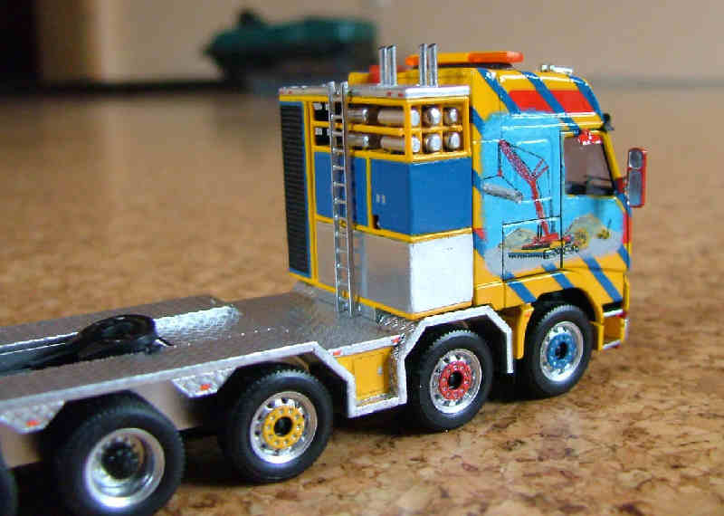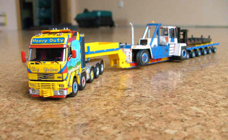 Der erste Fünfachser bei Heavy Duty. Ich habe mir gedacht, daß die zusätzlichen Achsen dem Volvo ganz gut zu Gesicht stehen. Ich stehe hoffentlich mit meiner Meinung, daß dem so ist, nicht ganz allein da. Weiterhin habe ich dem Volvo ein bei Schwerlastzugmaschinen nur selten zu sehendes Extra verpasst. Eine "Airbrush"-Lackierung. Diese zeigt die Zugmaschine bei den vielleicht irgendwann anstehenden Arbeiten. Damit die Arbeit nicht zu kurz kommt, steht auch gleich das Ladegut auf dem Tieflader. Der von kibri freundlicherweise bei einem Bausatz mitgelieferte Kalmar wurde lackiert und "ein wenig" angerostet. Warum musste der auch so lange am Hafen stehen? Auf jeden Fall geht der jetzt zur Generalüberholung in die Werkstatt. Genug geschrieben. Viel Spaß beim Anschauen der Bilder. |