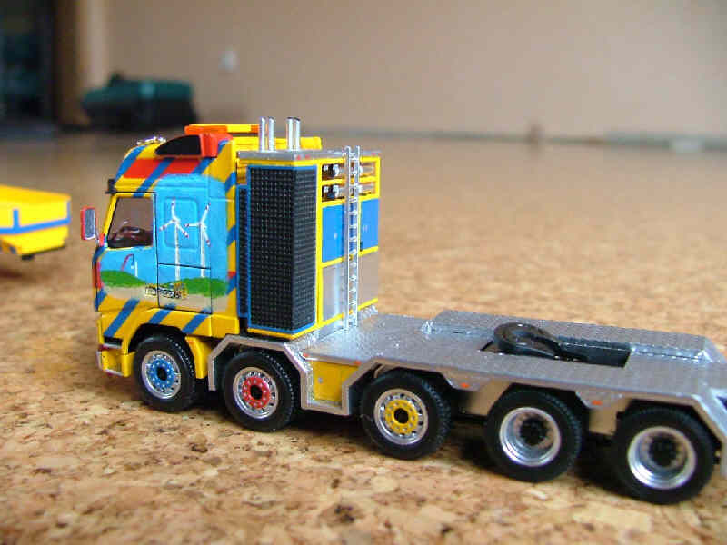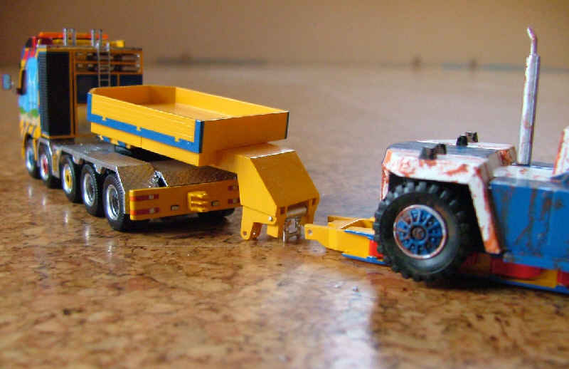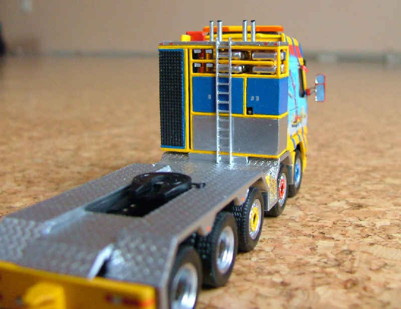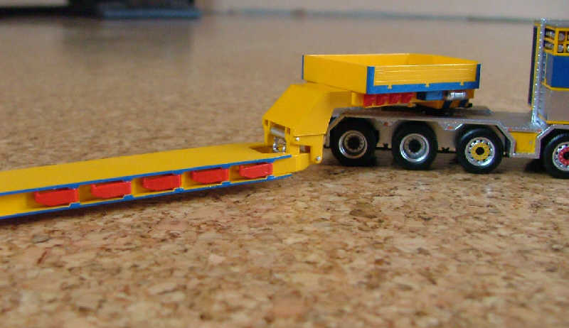 Der Tieflader an dem Volvo. Da der Schwanenhals des kibri-Modells zu kurz war, und ich außerdem die vordere Anschlußplatte der Plattformroller nicht haben wollte, habe ich das ganze etwas abgeändert. Jetzt kommt ein verlängerter herpa-Schwanenhals zum Einsatz. |