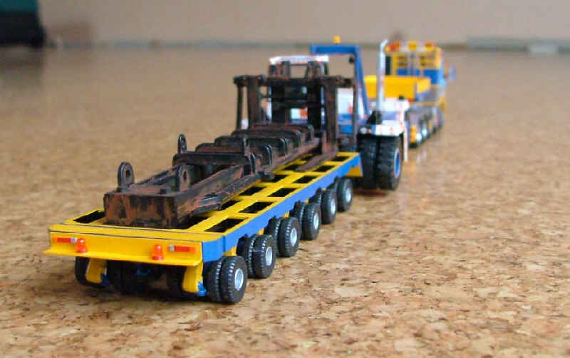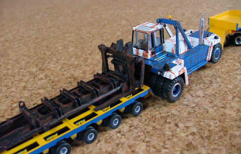 ...wie auch ein Blick auf die Hubeinrichtung verrät. Der Rost wurde übrigens mittels brauner Acrylfarbe aufgetragen. Außer viel Rost kann man diesem Foto auch noch die rückwärtige Beleuchtung des Tiefladers sehen. |
