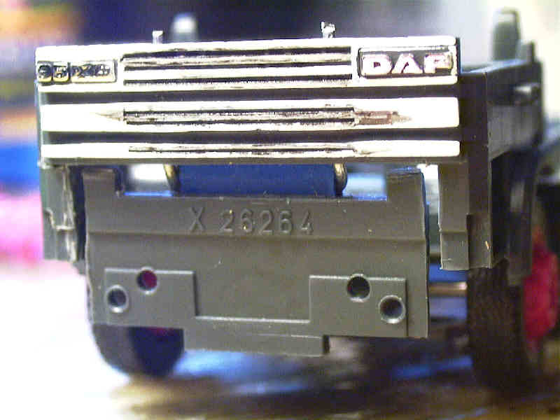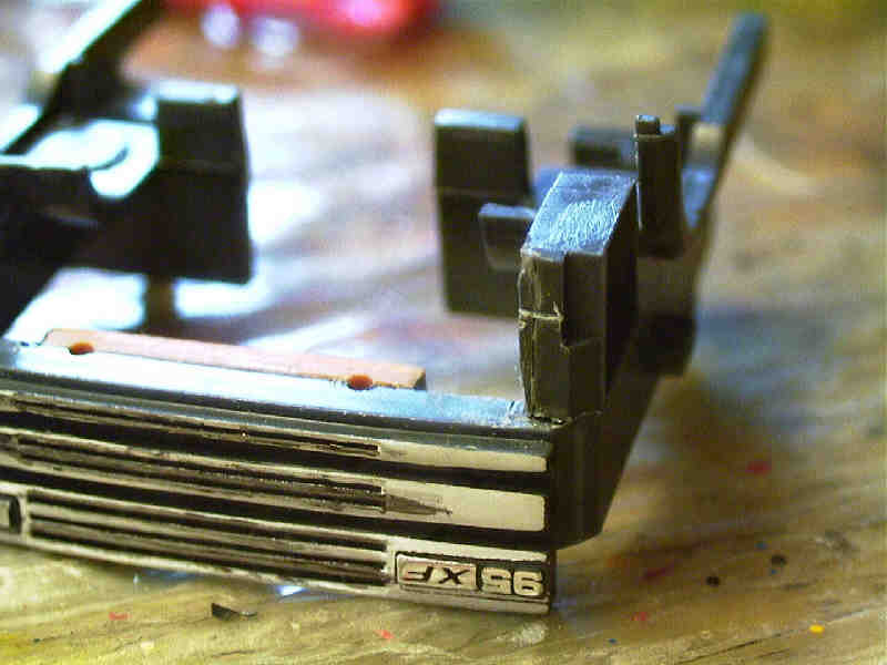 Der Kühlergrill in der Nahaufnahme, hier kann man die Schnittkanten der Fahrgestellaufnahme und die Löcher für den Draht erkennen. |