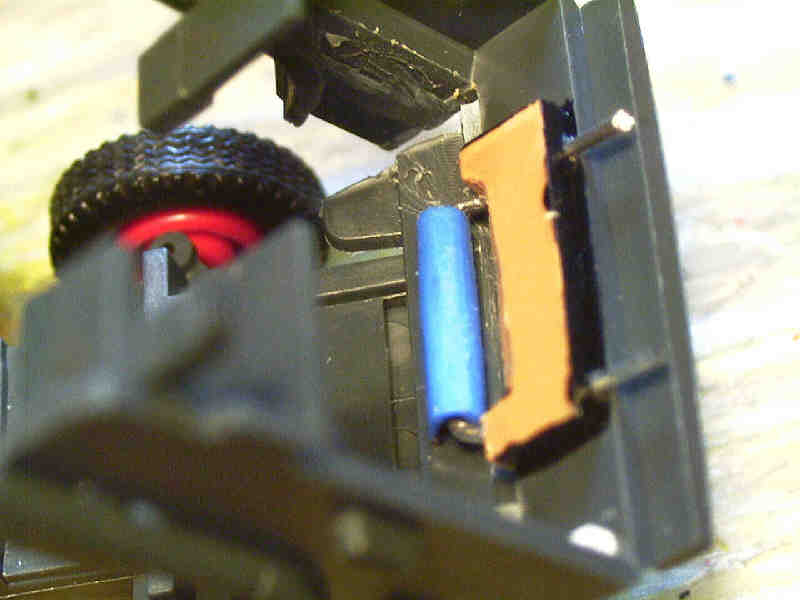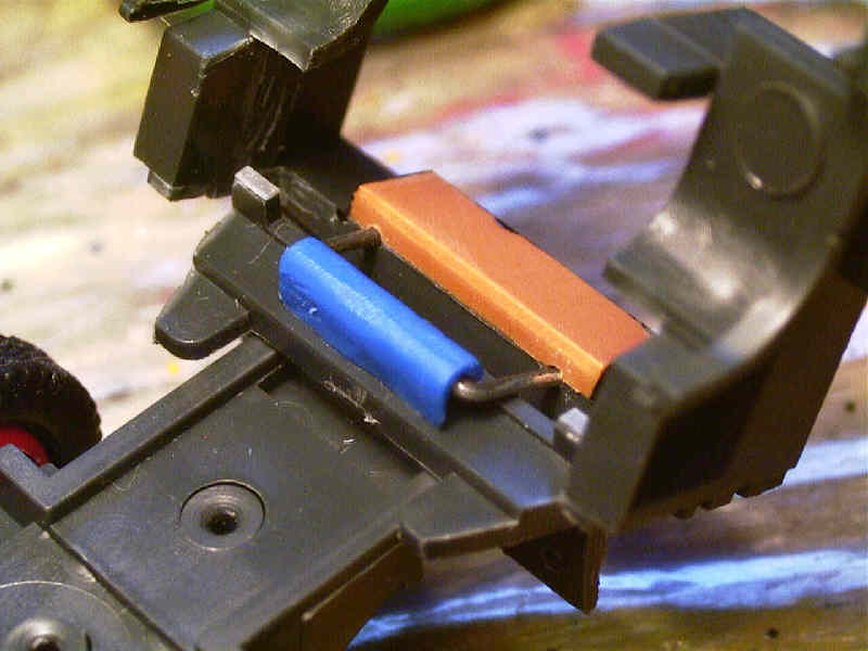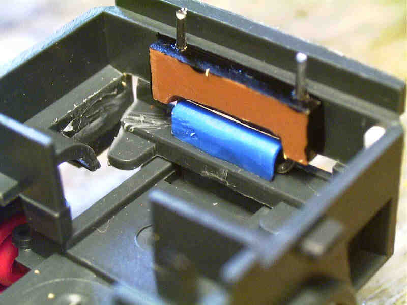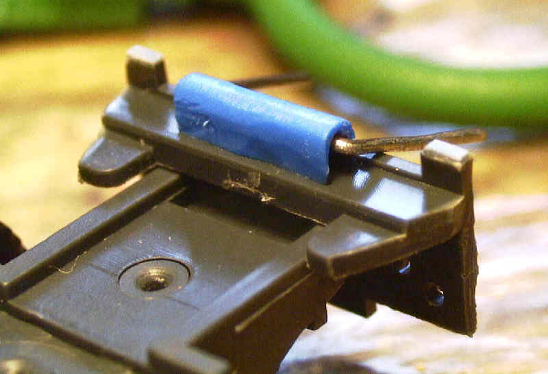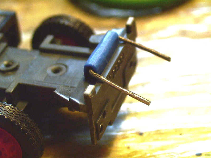 Das aufgeklebte U-Profil mit dem Draht der als neue Fahrerhausaufnahme dient. Den Draht vor dem Ankleben in das U-Profil legen! Die Fahrgestellhalterung muß an der Unterseite mit einem Polystyrolstück gegen den Motorblock abgestützt werden um ein Verdrehen zu verhindern. Man kann es aber auch ankleben. |