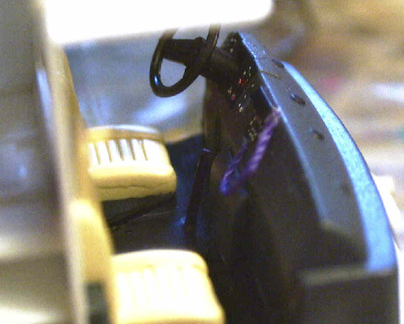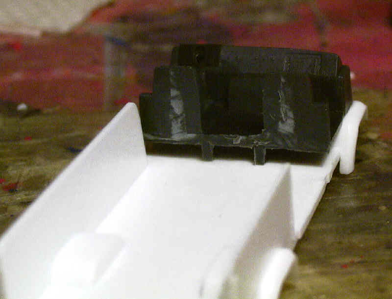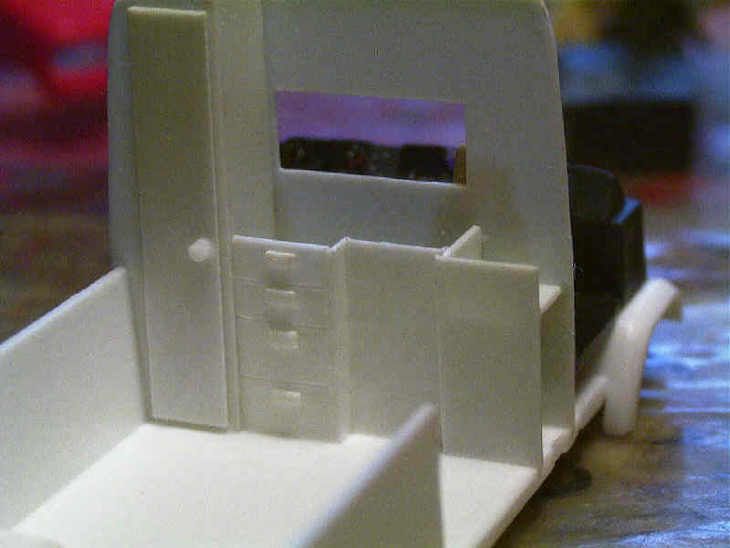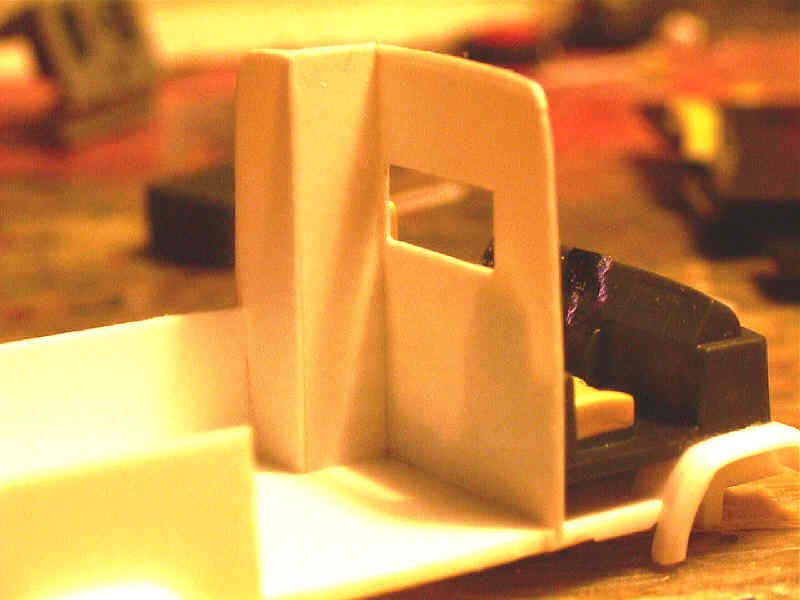 Als nächstes klebt man die Trennwand ein. Vorher unbedingt messen, ob sie auch wirklich passt. Außerdem sollte man sich vorher entscheiden, ob man die Verglasung einteilig lässt, oder ob man sie in zwei Teile teilt. Ich habe mich für die zweiteilige Variante entschieden. Daher muß die Trennwand auch nicht abgestuft werden. In der Trennwand sollte man das Fenster zum Fahrerraum nicht vergessen. Hinter der Trennwand ist der erste Teil des Schrankes zu sehen. |
