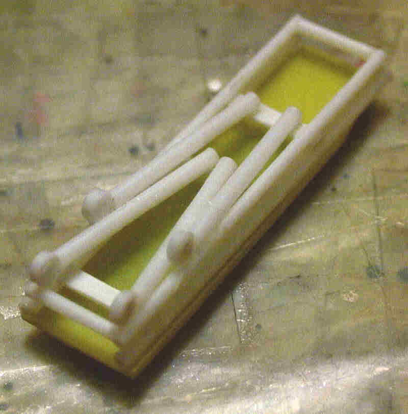 Zu einem Rettungswagen gehört natürlich auch eine Trage. Hier im Rohbau zu sehen. Die gelbe Platte ist 21 x 6 mm groß. Das Fahrgestell habe ich aus 0.8mm-Polystyrolstäben gebaut. Je nach Hersteller des Fahrgestells gibt es da unterschiedliche Anordnungsvarianten für die verschiedenen Bügel. Ich habe mich für die Variante "Stollenwerk" entschieden. |