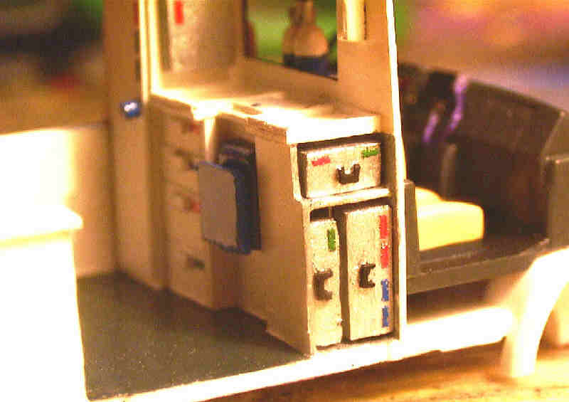 Und noch etwas mehr, eigentlich schon fast im endgültigen Zustand. Also schon lackiert und mit einigem Zubehör: Medikamentenschrank (silber), Betreuersitz, Handdesinfektionsmittelspender (ein schrecklich langes Wort, ist aber so), Kofferaufnahme mit Edelstahl beplankt.... |