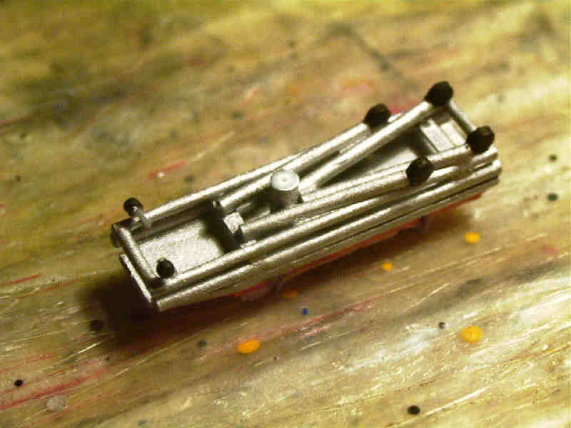 Auf diesem Bild dann im fertigen Zustand. Den dicken Polystyrolzylinder in der Mitte habe ich eingebaut um die Trage später haltbar auf dem Tragetisch ankleben zu können, die Kontaktfläche der Räder ist doch ziemlich klein, und es wäre ärgerlich, wenn die Trage bei jeder Erschütterung wieder abfallen würde. Also habe ich mir ein große Klebefläche eingebaut. |