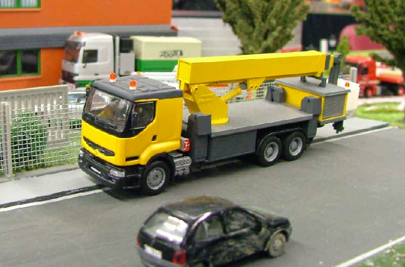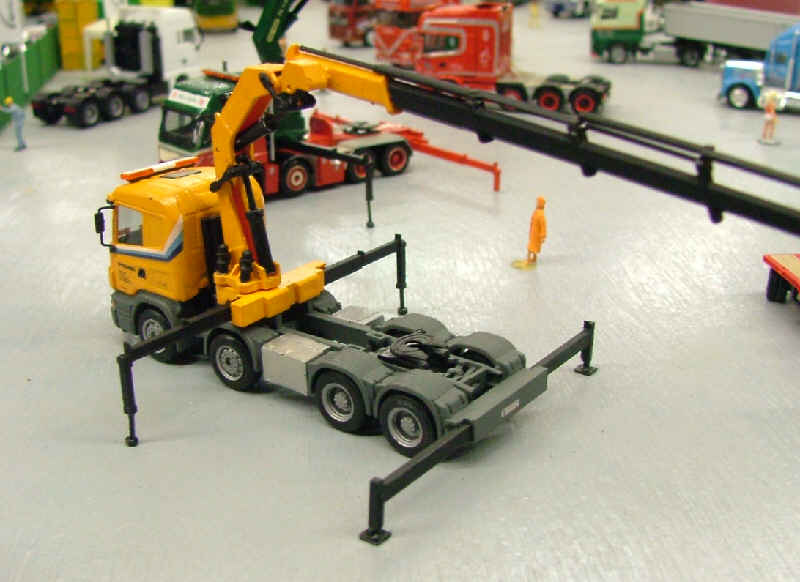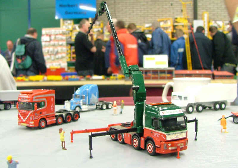 Neben den gelb-grünen Autos hatte er auch einige Modelle nach Vorbild dabei. So z.B. diesen aufwändig umgebauten Volvo FM 12 mit riesigem Ladekran. Auch einige Fahrzeuge von Finn Hansen waren vertreten. |