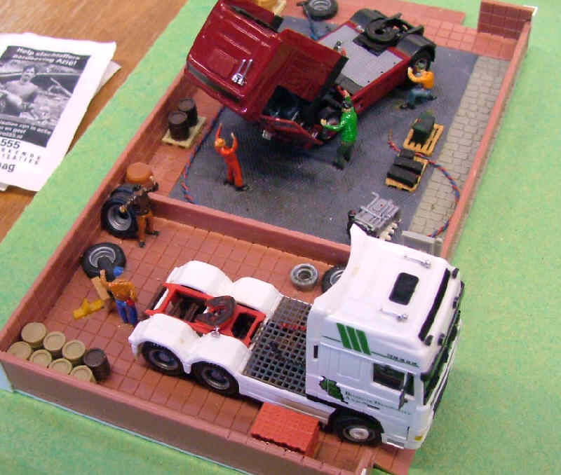 Der rote DAF wird gerade einer Inspektion unterzogen, der weiße hat neue Reifen bekommen. |