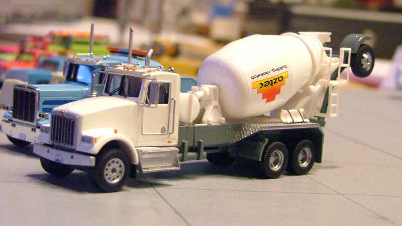 Ab jetzt gibt es Modelle mit Namen. Die folgenden stammen von Kurt Hofmeyer. Er hatte einige wenige recht schöne US-Modelle mitgebracht, u.a. diesen Betonmischer auf Kenworth-Fahrgestell, |