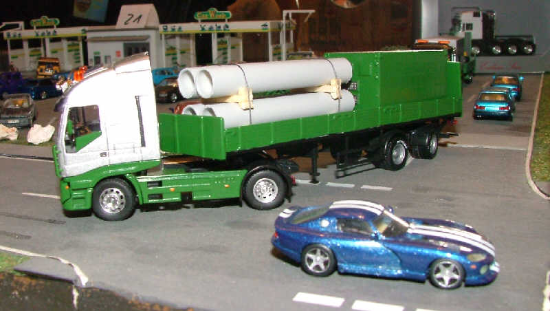 Aber auch klassische Fahrzeuge der Spedition Zoobie waren zu sehen, wie dieser Iveco-Stralis Sattelzug, dessen Auflieger mit gelenkter zweiter Achse aufwartet. |