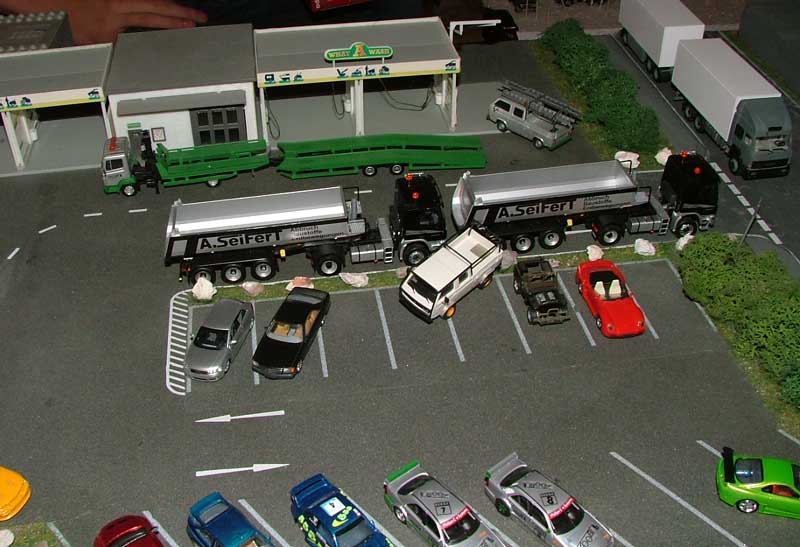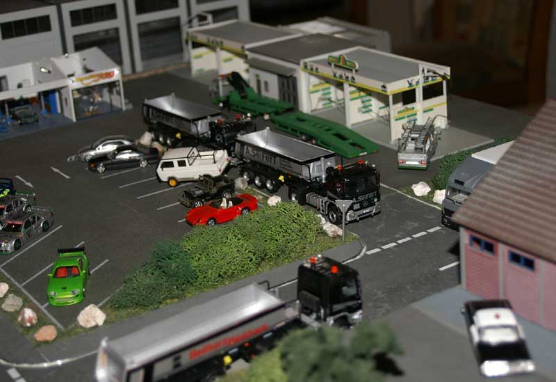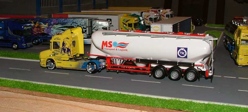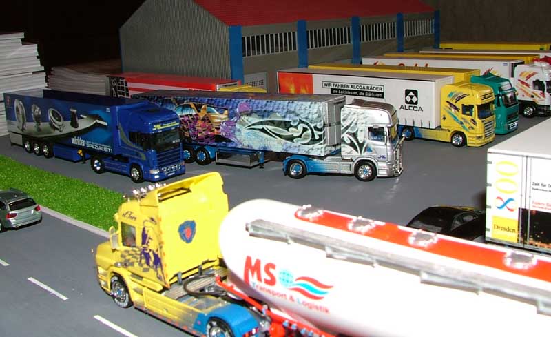 Andreas Gleisenberg war inklusive Firmenhof und Fuhrpark angereist. Der Scania im Vordergrund ist unterwegs mit einem Auflieger von Michael Scheel. Kooperation im Maßstab 1:87. |