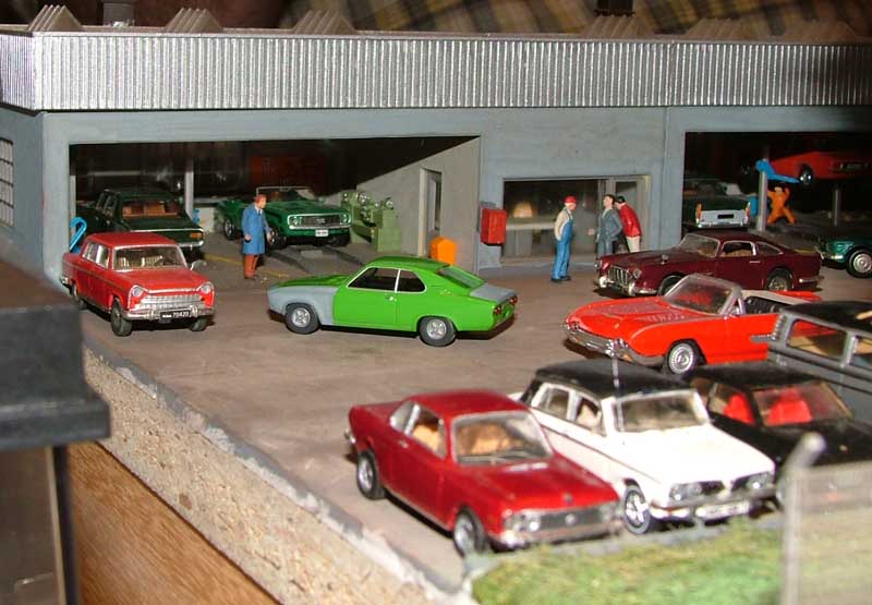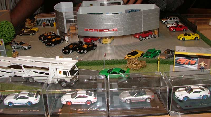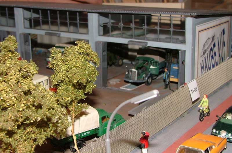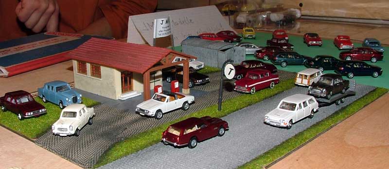 Ein Stück weiter konnten die Preiserlein Neufahrzeuge erwerben. Paul Arens hatte in seinem Autohaus vieles aufgefahren, was schell und teuer ist. |