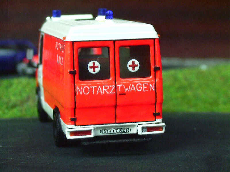 Das Vorbild dieses Fahrzeugs hatte einen Ausbau von der Firma Binz, ansonsten einen für bergige Gegenden etwas schwachbrüstigen Motor, aber dafür viel Platz im Patientenraum, um darin zu arbeiten. Die Ausstattung umfasste alles was in so ein Auto eben rein gehört. Das Modell ist aus einem ebensolchen von herpa entstanden. |