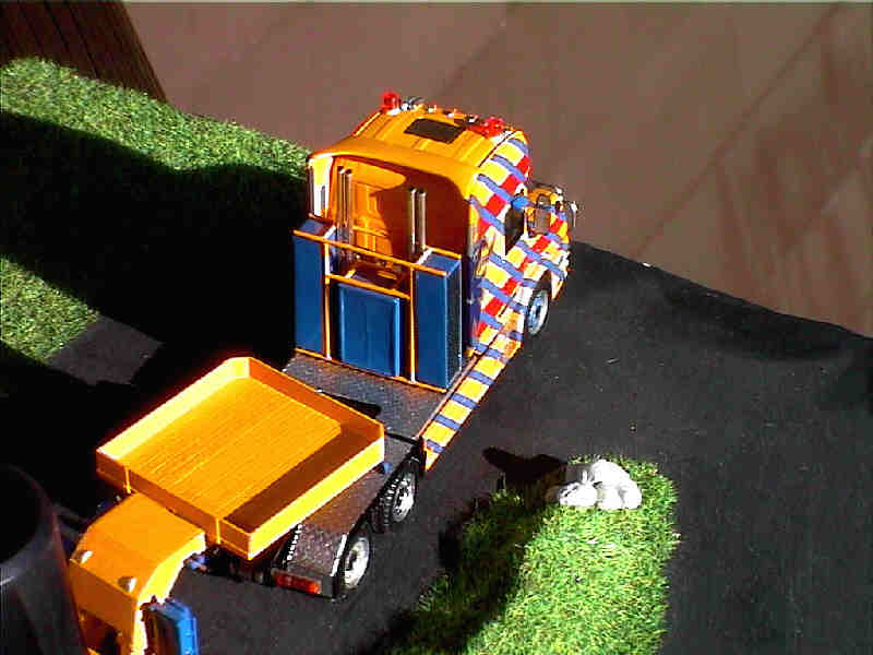 So sieht die Zugmaschine dann im Arbeitsalltag aus. Der Auflieger ist der 5-achsige Scheuerle-Tieflader aus dem kibri-Programm. |