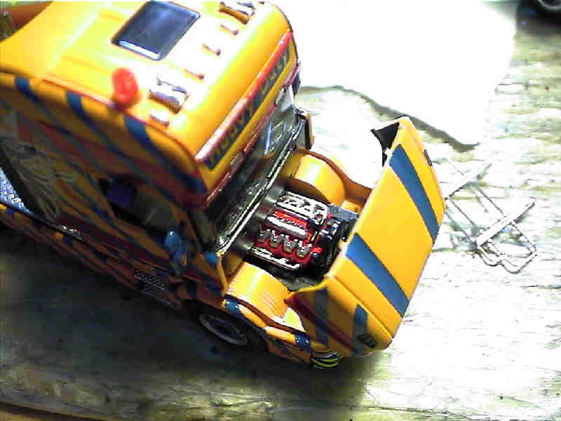 Das ist das erste schwere Fahrzeug der Spedition gewesen. Die herpa-Zugmaschine hat eine dritte Achse aus Polystyrolplatten bekommen. Weiterhin jede Menge Riffelblech und einen Eigenbau-Schwerlastturm. |