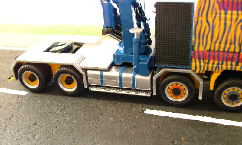 Und hier das ganze im Bild. Man kann schon einiges erkennen. Registerkupplung, Schwerlastturm, Ladekran, und ein ordentlicher Radstand. Alternativ zum sonstigen parallelgestreiften Design kommt der Terberg mal im Tigerlook daher. |