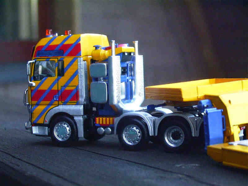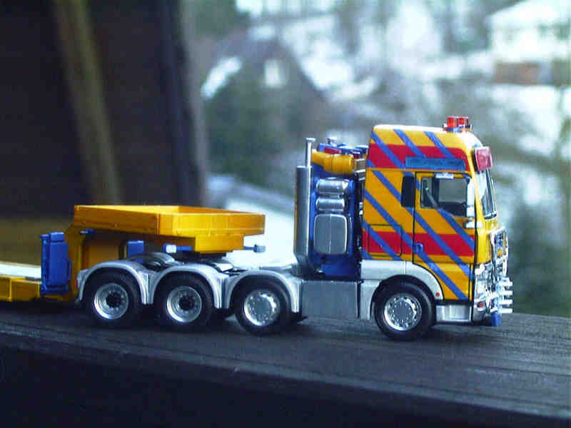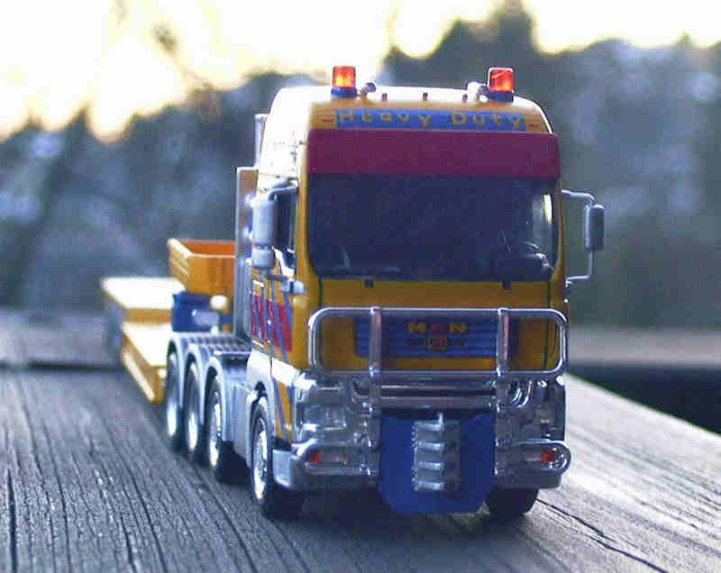 Im Heavy Duty-Fuhrpark befindet sich neben den vielen Nordlichtern auch eine der nicht ganz schwachen MAN-Zugmaschinen. Aber kann denn Leistung Sünde sein? Ab und zu vielleicht, aber nicht immer. Das Modell ist auf Basis der Hochtief-Version des herpa-Modells entstanden. Neben der Farbe kamen noch kleine Detailverbesserungen und einige Chromteile dazu. |